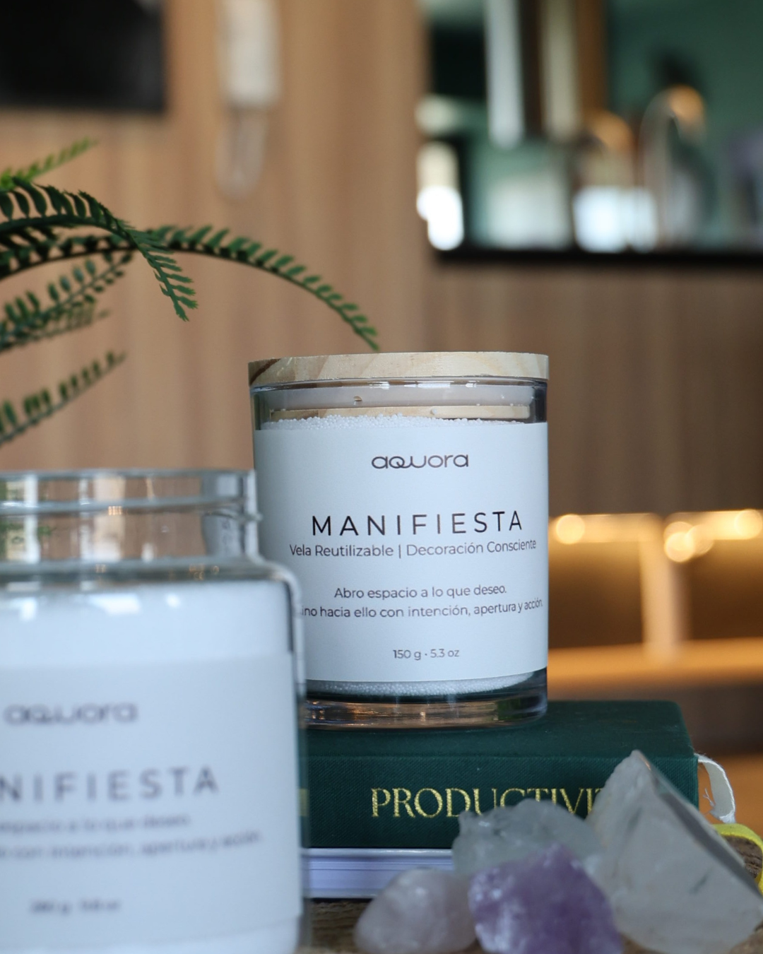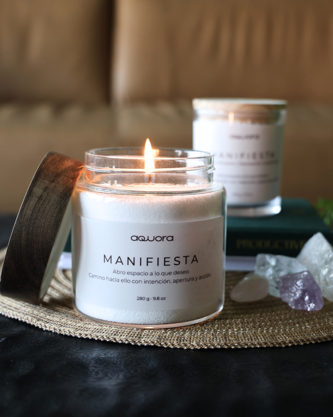 Manifiesta es una vela creada para recordarte tu poder de elegir, enfocar y atraer lo que deseas.